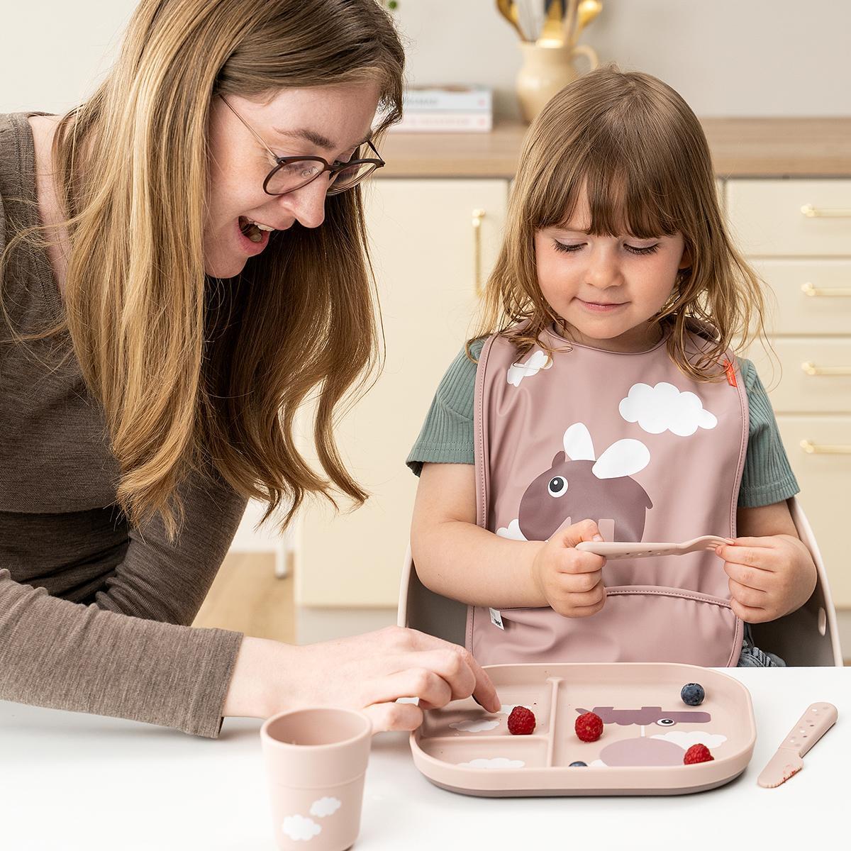 The compartment plate in powder is printed with a playful Happy clouds motif. Croco and Birdee explore the world among the clouds and invite your child to experience new flavours and consistencies. The bases darker powder adds a two-coloured detail.