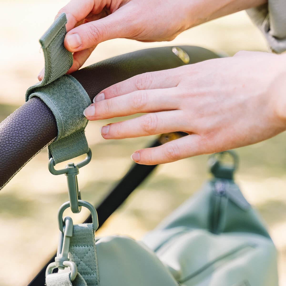 - Attach the bag to a carrycot handle using the included pram hooks