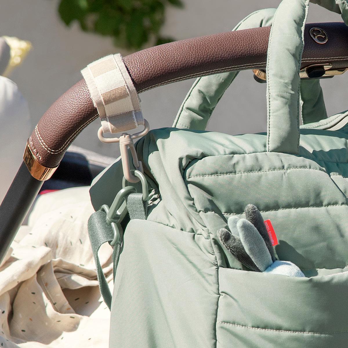 - Quilted bag in cool green shades with signature stripes on the pram hooks