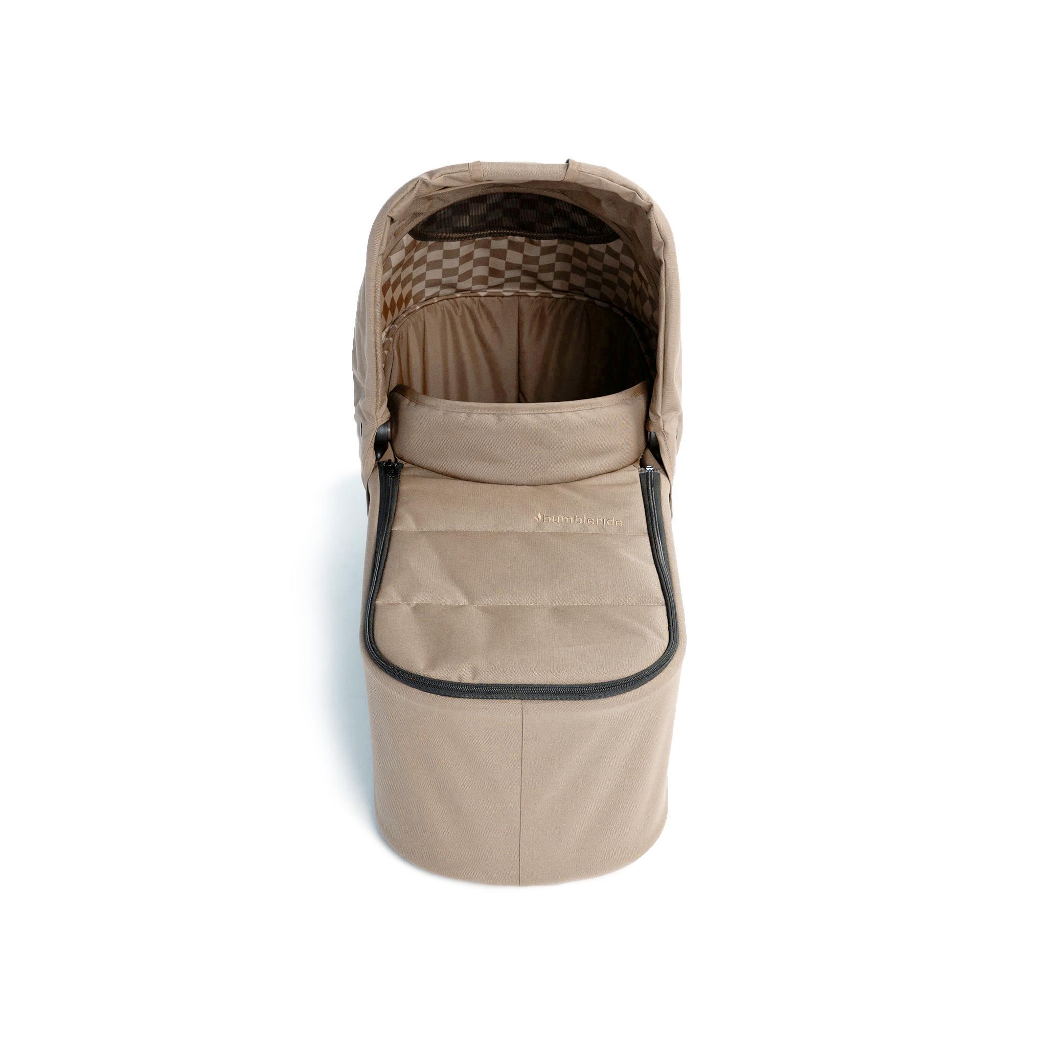 The Bumbleride single stroller Bassinet is an infant bed using OEKO-TEX certified 100% recycled polyester fabric, a vented wood base board and breathable polyester honeycomb mattress. The new bassinet has an added wind guard for extra protection from the elements. Compatible with 2016-2022 Bumbleride Era, Indie, and Speed, this Bassinet converts your stroller into a parent facing pram. Featuring a large SPF 45+ canopy with a pop-out extension (shown folded back above), zip on wind cover, and one-handed carrying handle.