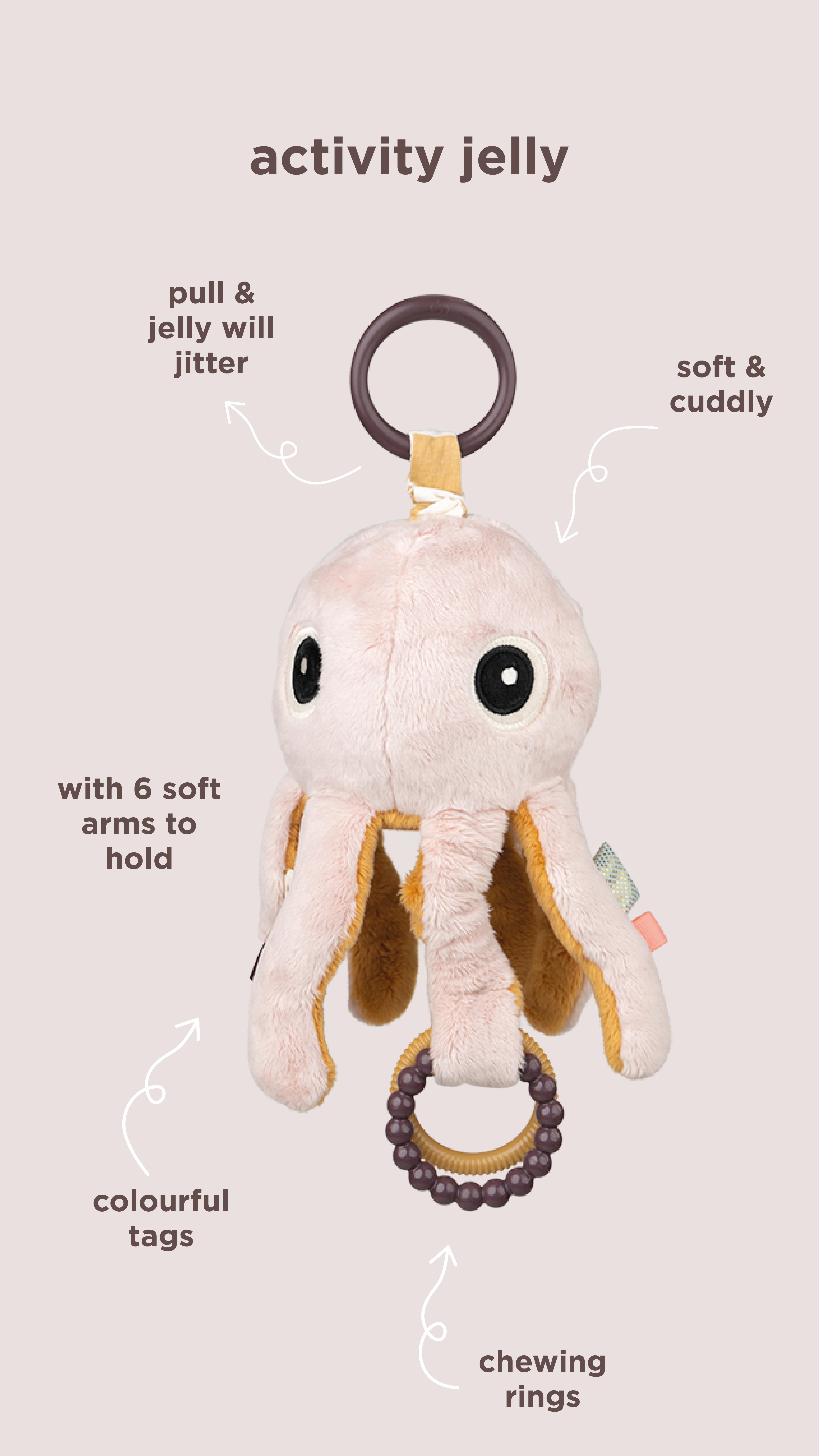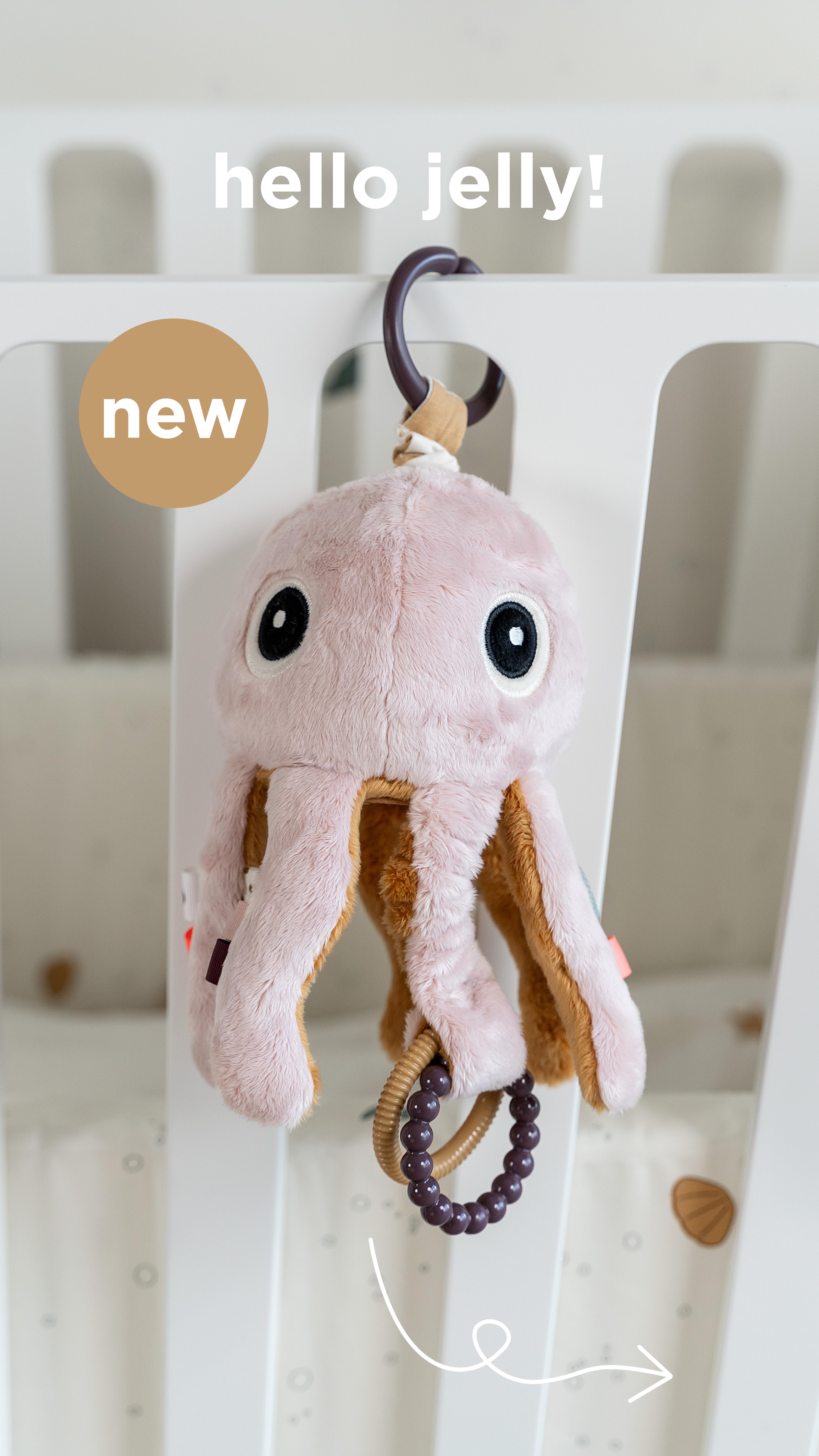 C-rõngaga saate armsa millimallika kinnitada lapsevankri, jalutuskäru, turvahälli või mänguaediku külge , et see oleks alati teie väiksekesele käeulatuses. Aktiivsusmänguasi Jelly on pehmetes toonides ja tema käte siseküljel on kontrastne sinepitoon.