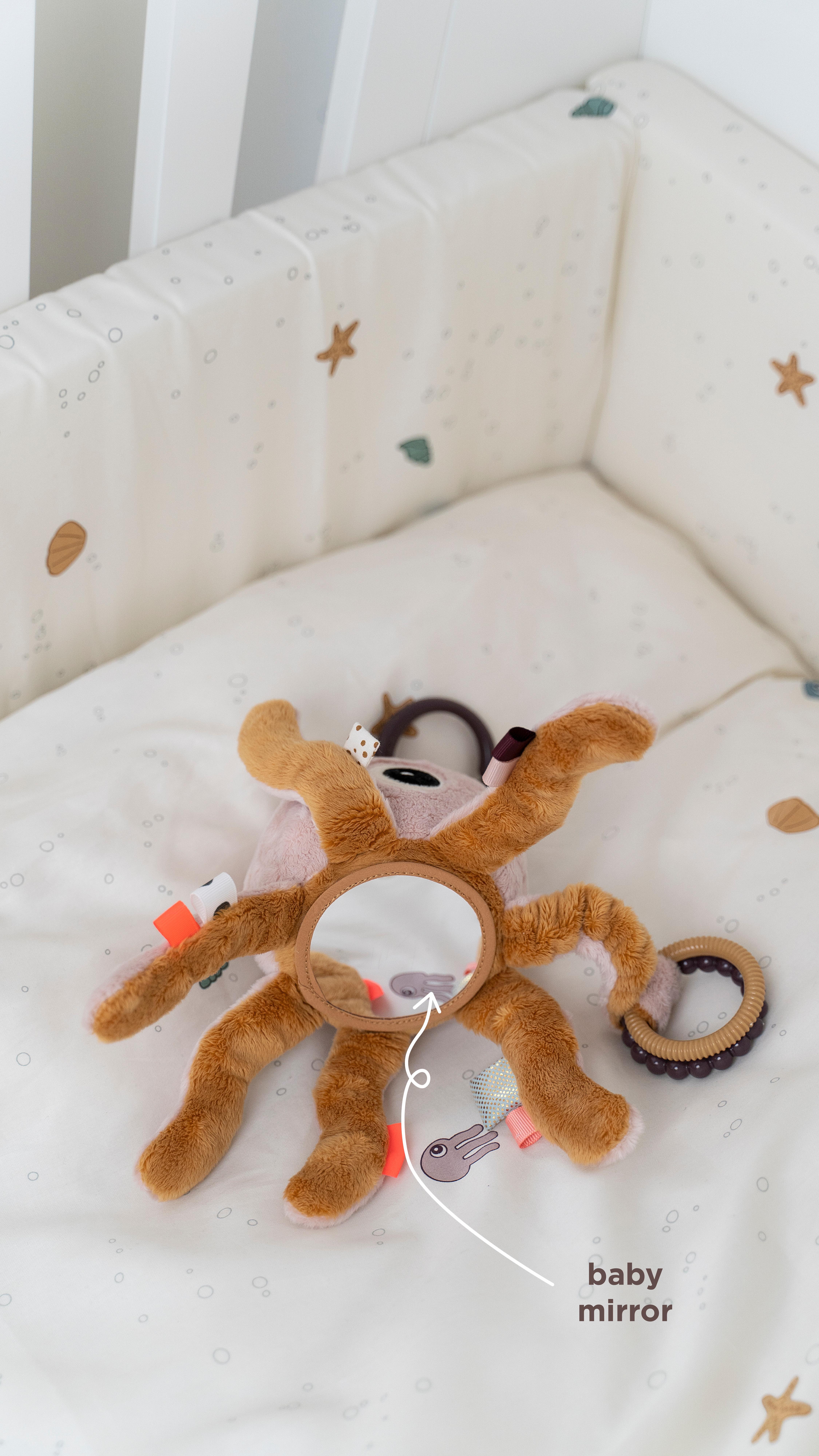 Laske uudishimulikel silmadel ja väikestel sõrmedel avastada kaheksajalg Jelly paljusid sensoorseid omadusi. Võtke kinni Jelly pehmetest kätest ja kuulake nende krõbisemist või tõmmake peal olevast mänguasja kinnitusest ja mänguasi hakkab vibreerima. Tunnetage pehmet tekstuuri ja avastage kaheksajalg Jelly kõhu all peituv peegel.