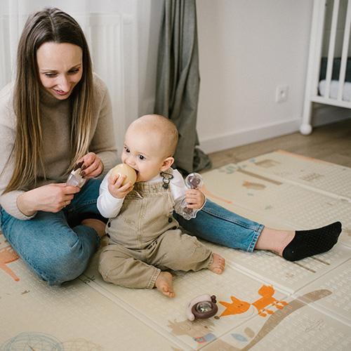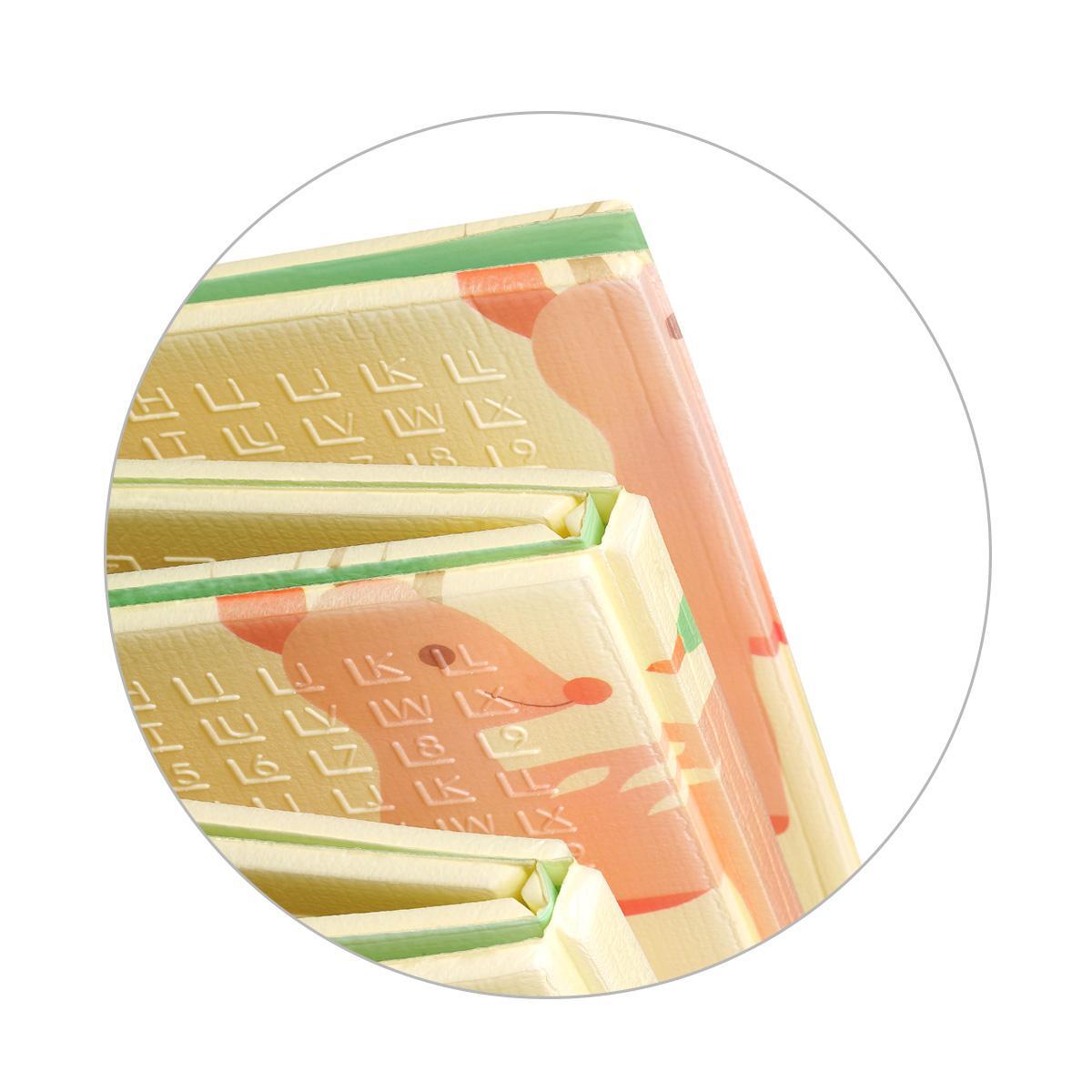 The two-sided folding mat offers colorful and diverse patterns and textures that help babies develop their eyesight and touch. It is filled with images of animals, letters, numbers and shapes that support intellectual and motor growth of the youngest users.