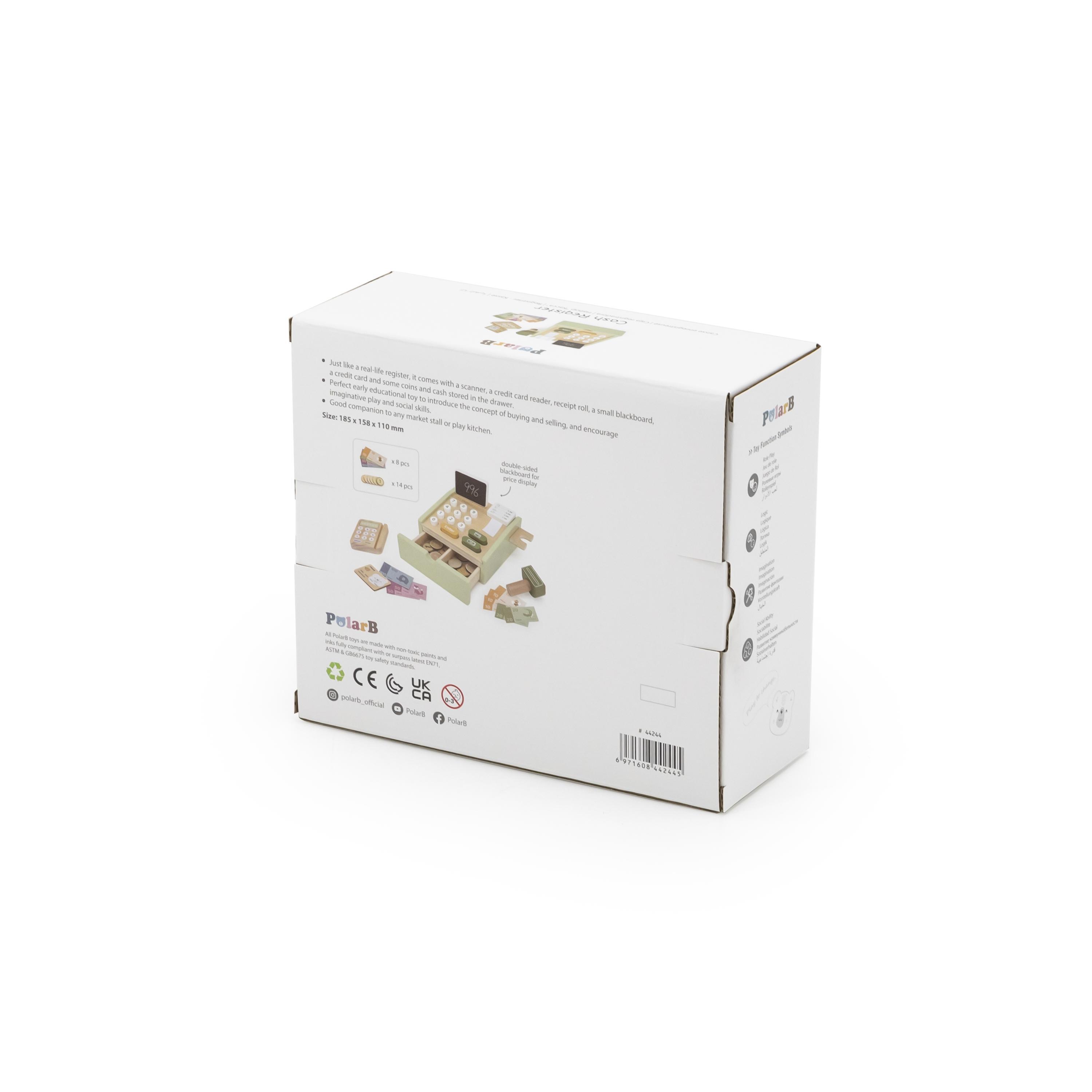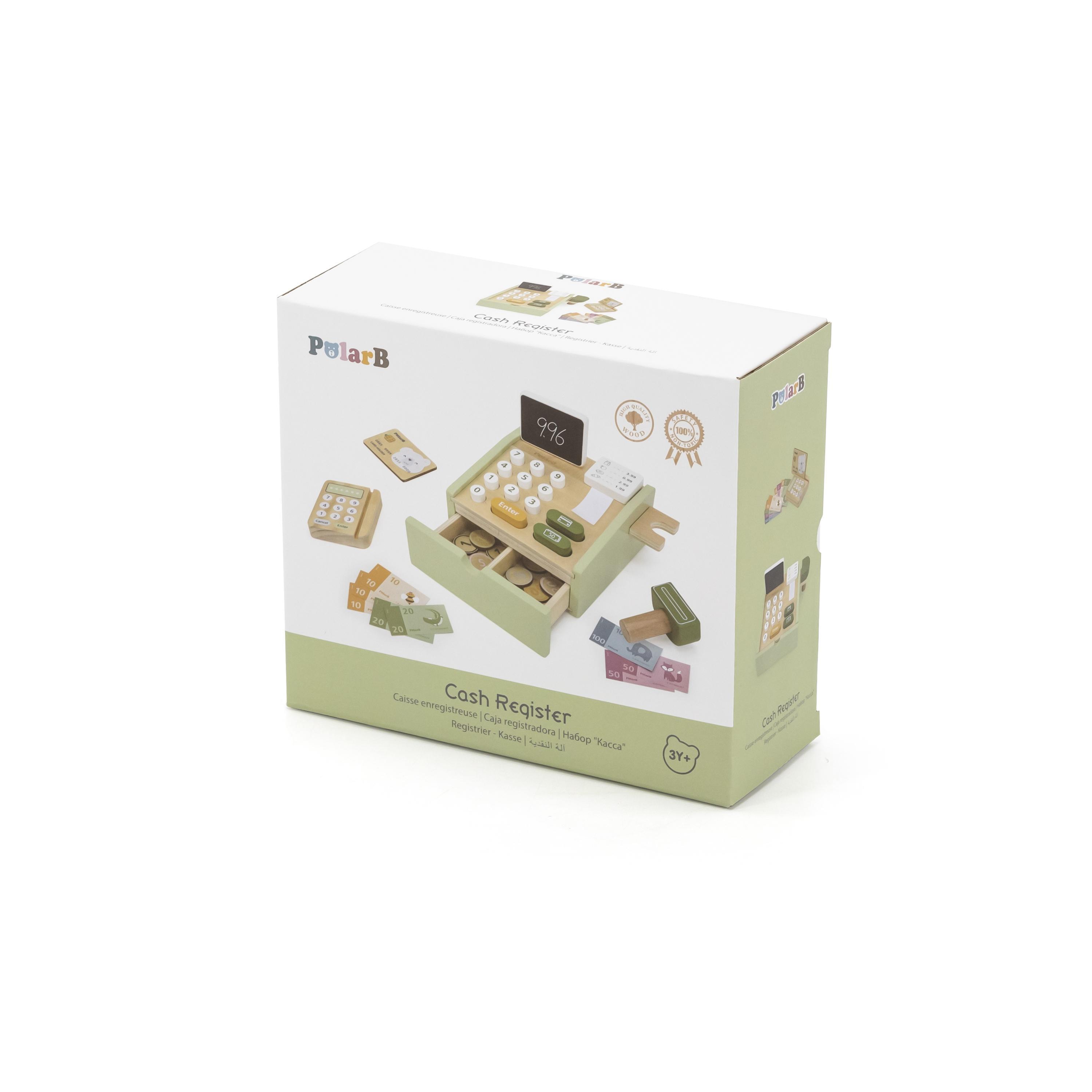 Lõbus puidust kassaaparaat, mis on realistlik. Sellega kuuluvad komplekti puidust kauba skänner, krediitkaardilugeja, kviitungirull, väike tahvel, krediitkaart ja mõned sahtlis hoiustatavad mündid.