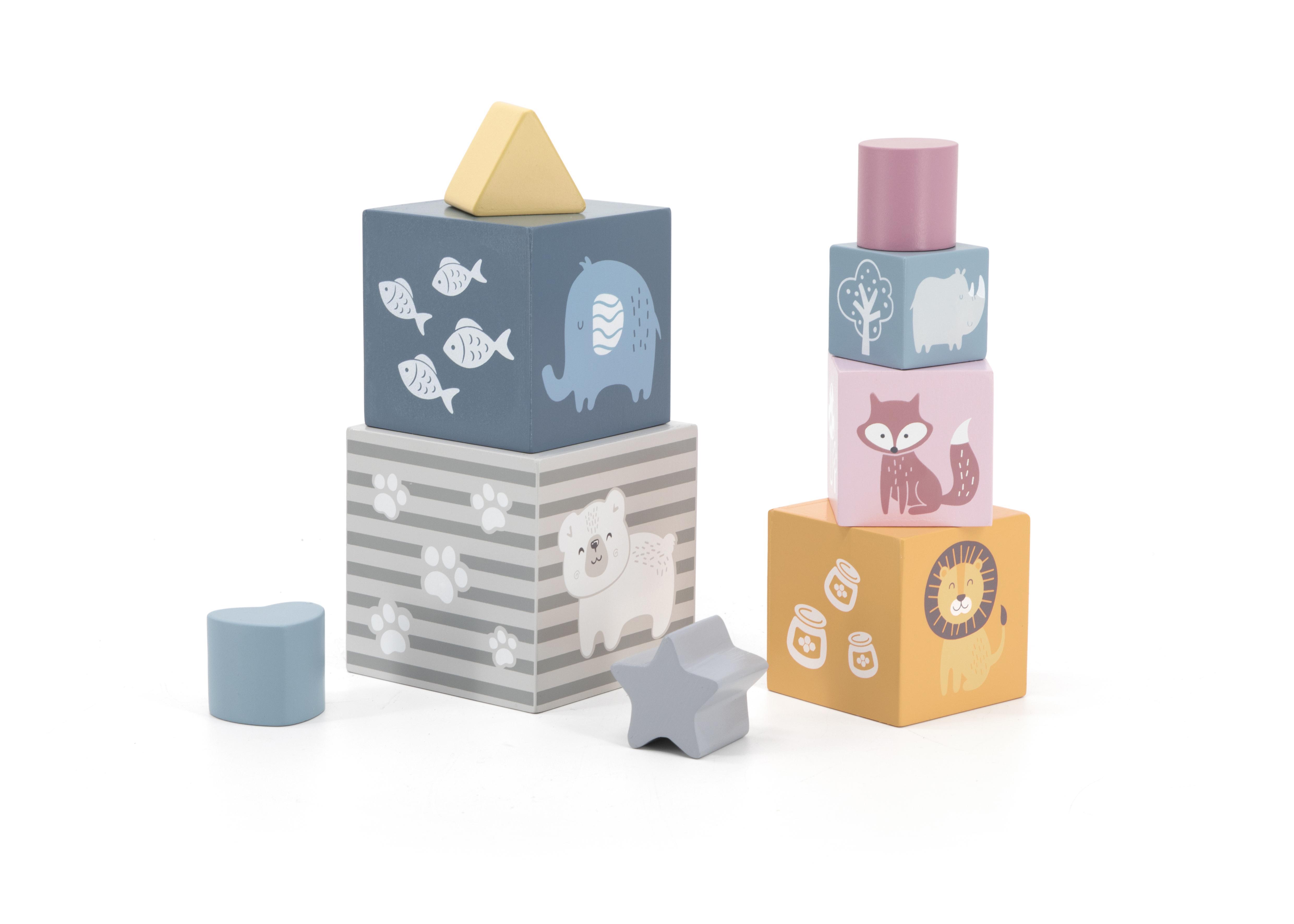 PolarB puidust ladumistorni komplekt koosneb 5 erineva suurusega karbist ja 4 täispuidust geomeetrilisest klotsist. Lisaks üksteise sisse mahutamisele, ladumisele ja kujundite sorteerimisele saavad lapsed õppida numbreid, kujundeid ja erinevaid loomi.