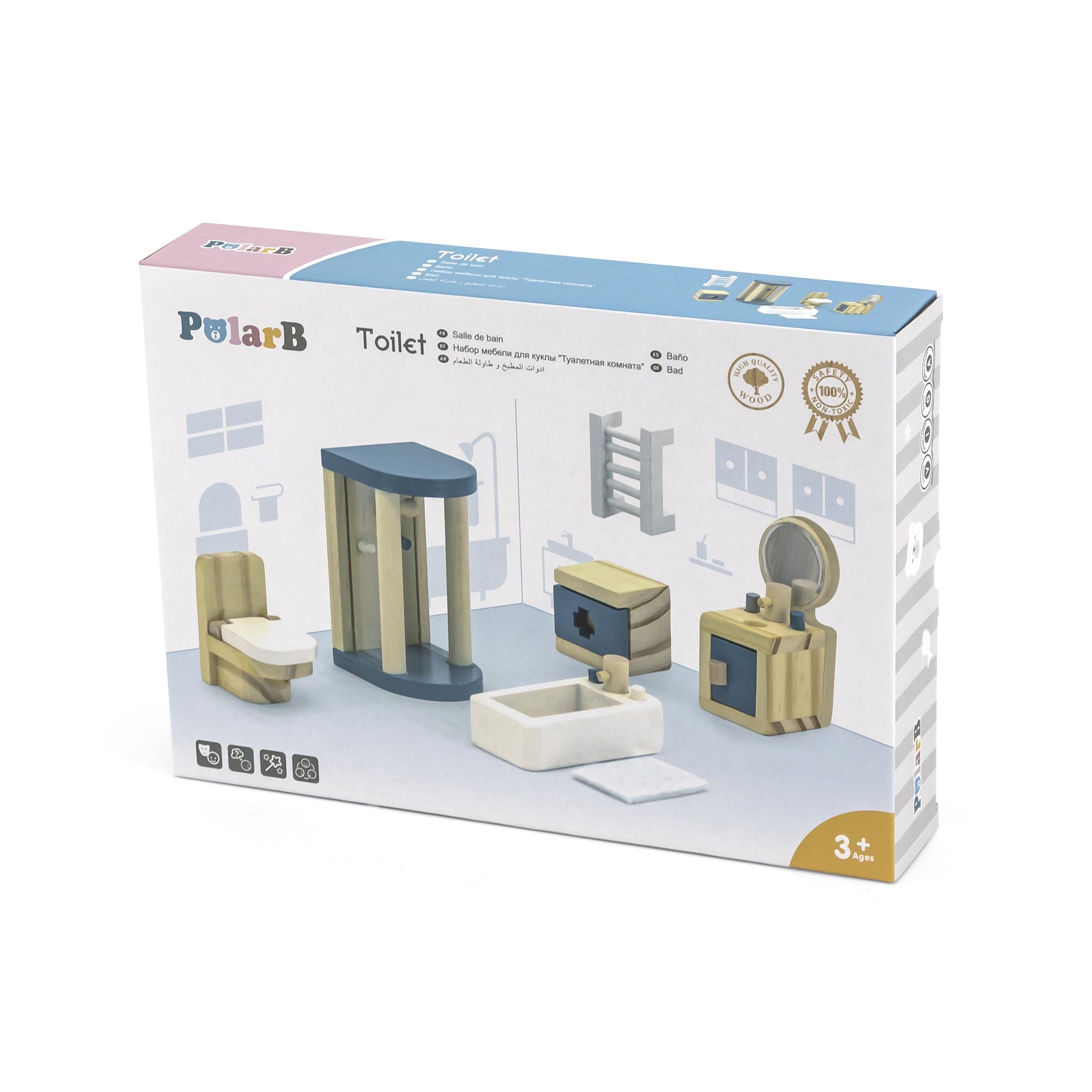 Lõbus, puidust vannitoa mööblikomplekt, mis koosneb 8-osast ning sobib hästi igasse nukumajja.